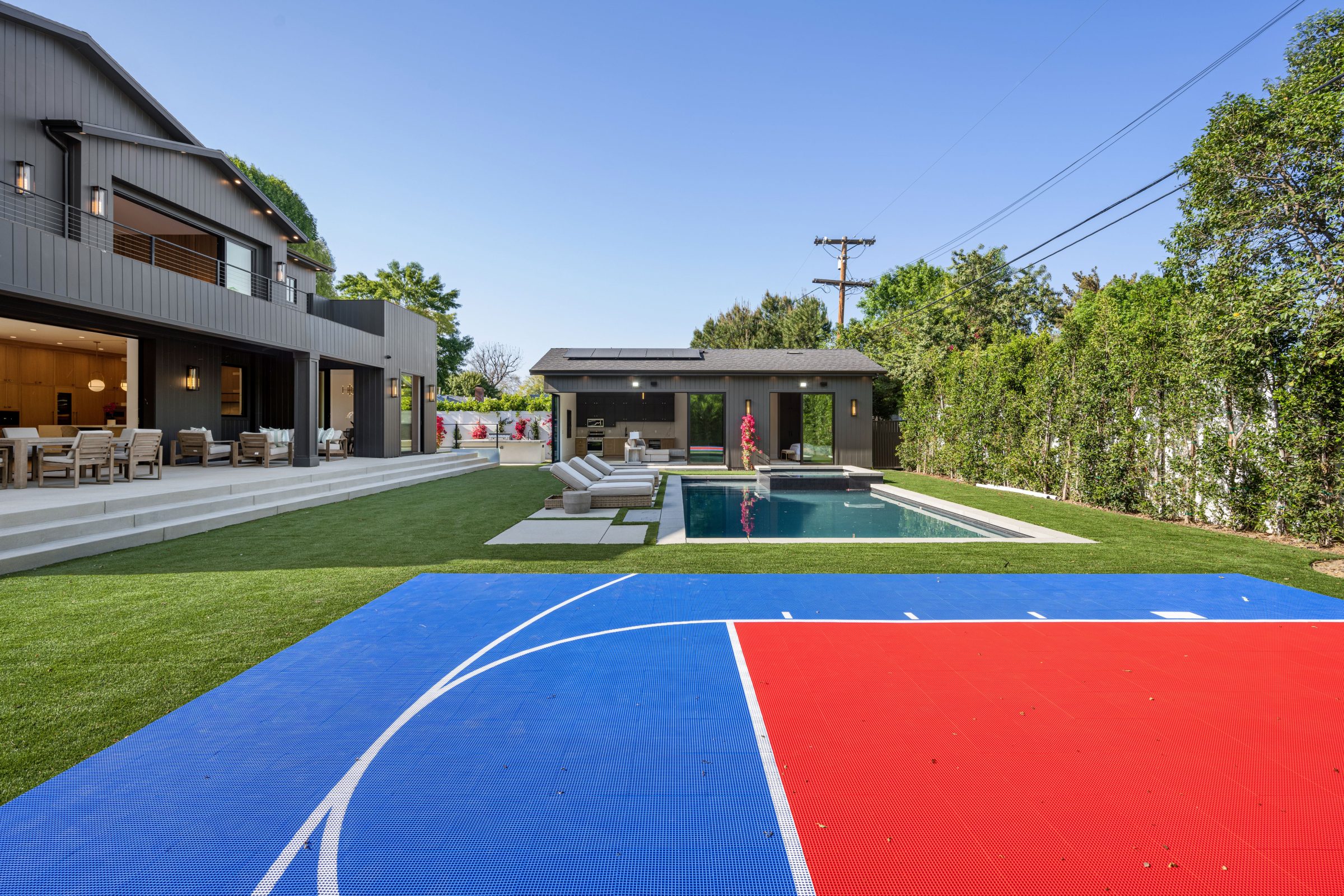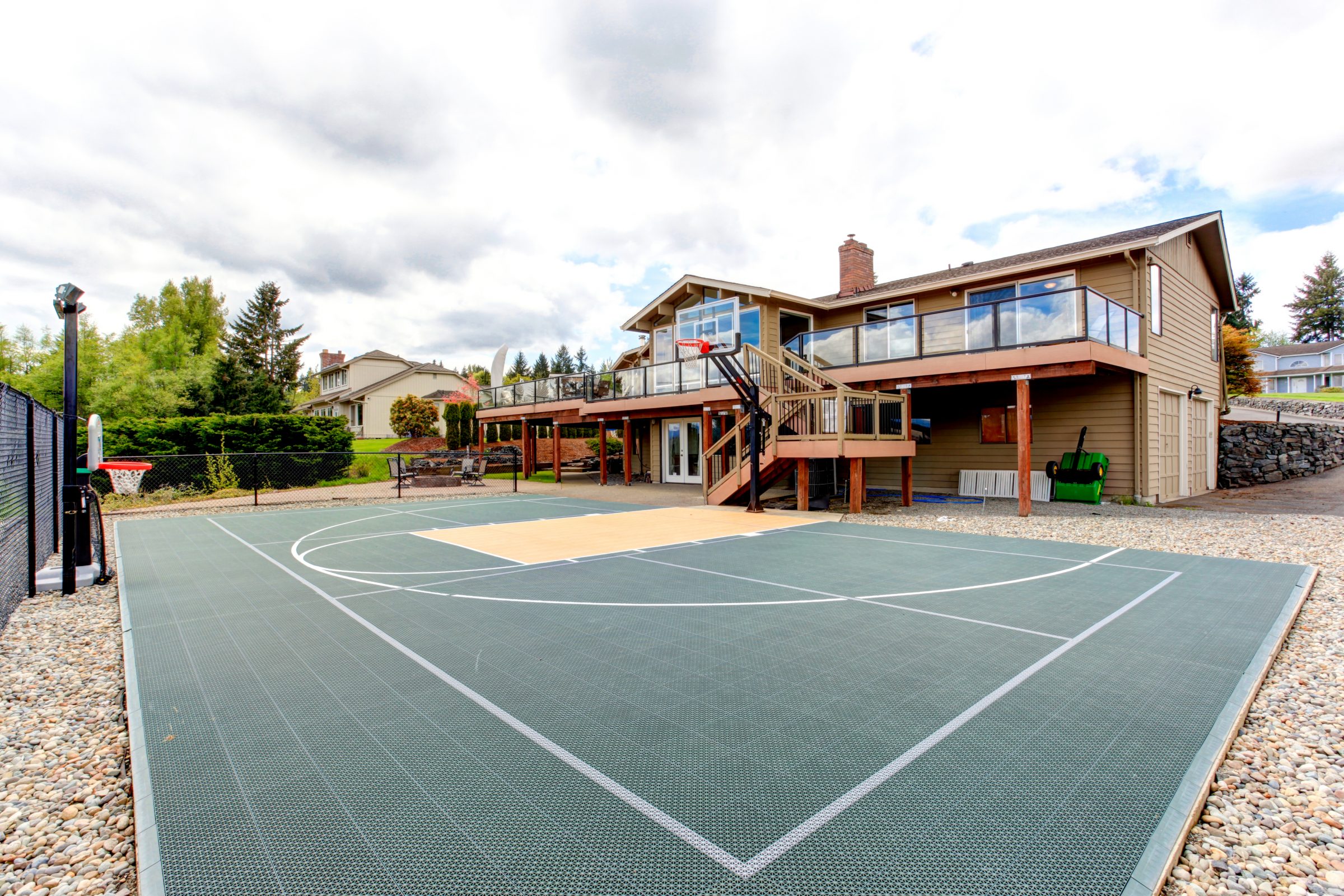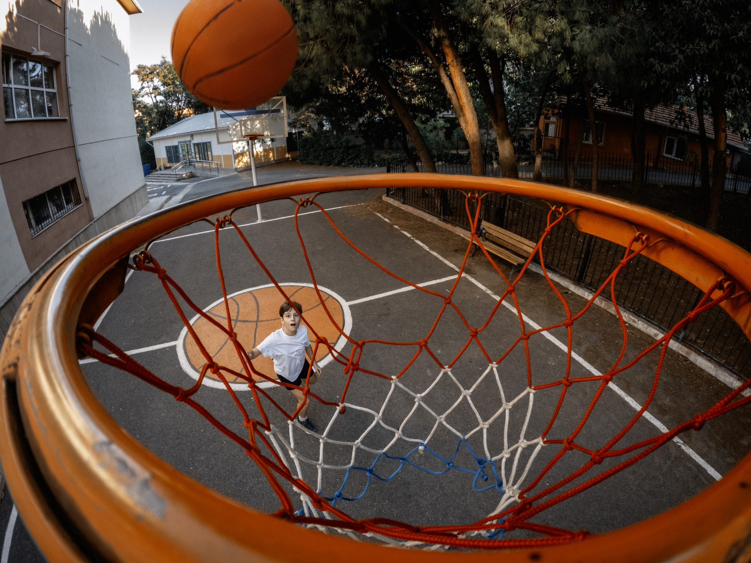 Outdoor court with basketball hoop and net.